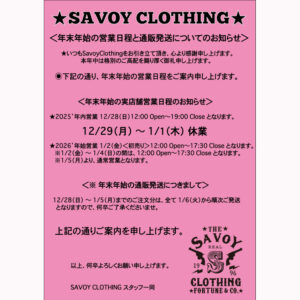 <年末年始の営業日程と通販発送についてのお知らせ> ★いつもSavoyClothingをお引き立て頂き、心より感謝申し上げます。 本年中は格別のご高配を賜り厚く御礼申し上げます。 ◉下記の通り、年末年始の営業日程をご案内申し上げ… もっと読む »